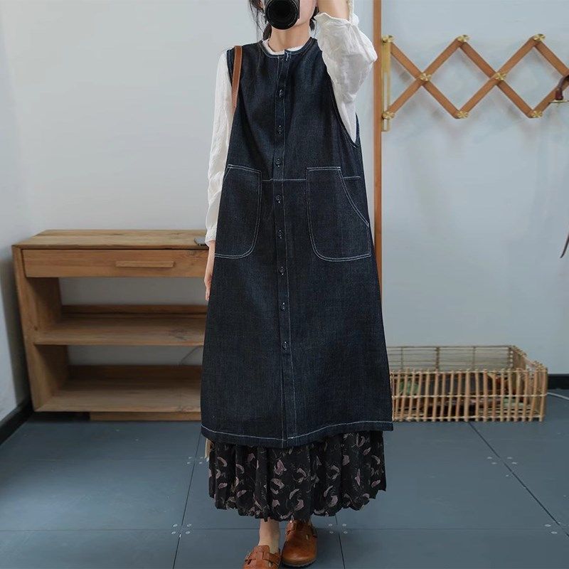 古与色 秋季韩版港风工装宽松腰A字中长裙百搭无袖牛仔马甲连衣裙