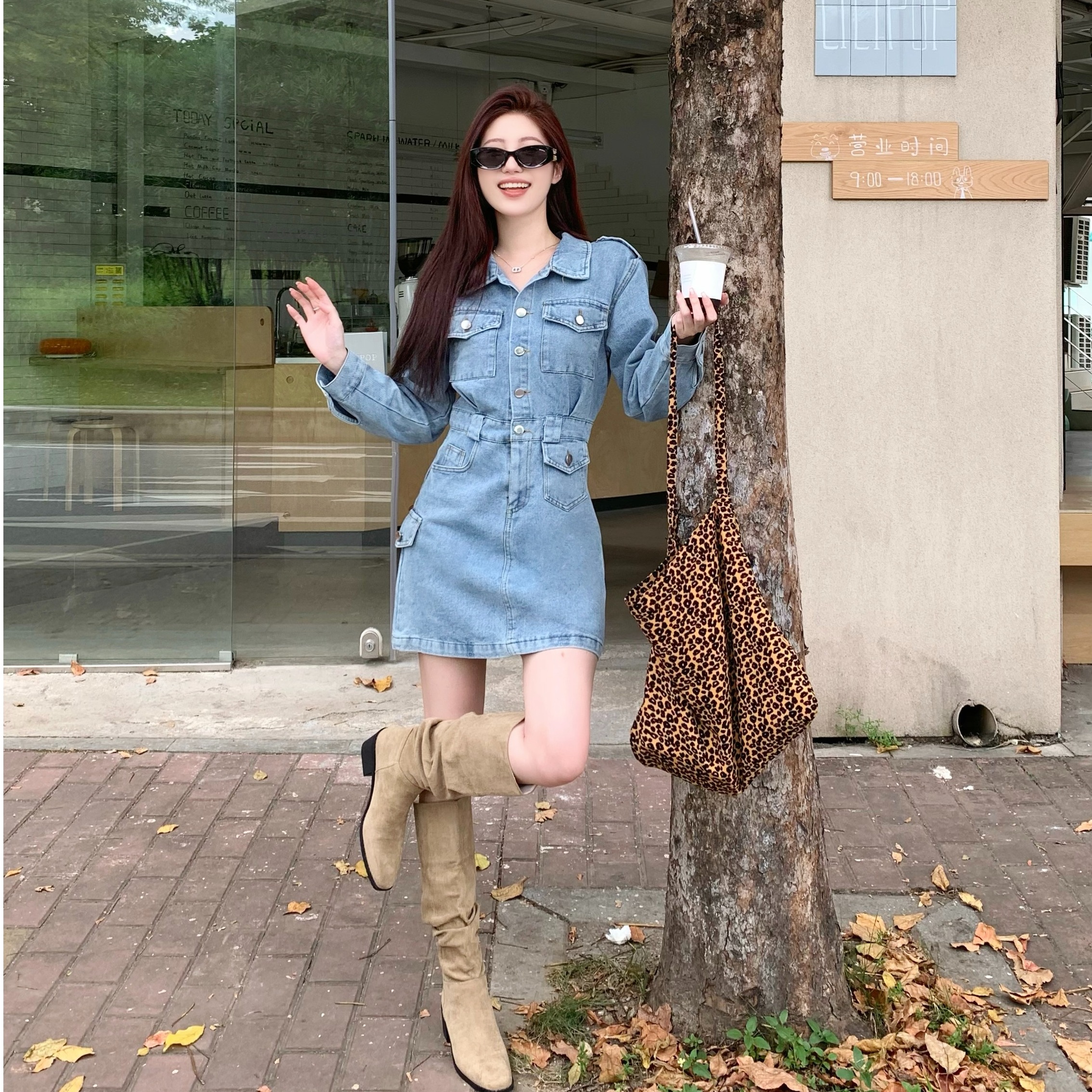 JVV SISTER秋季正品翻领收腰韩版A字气质连体裙中长款牛仔连衣裙