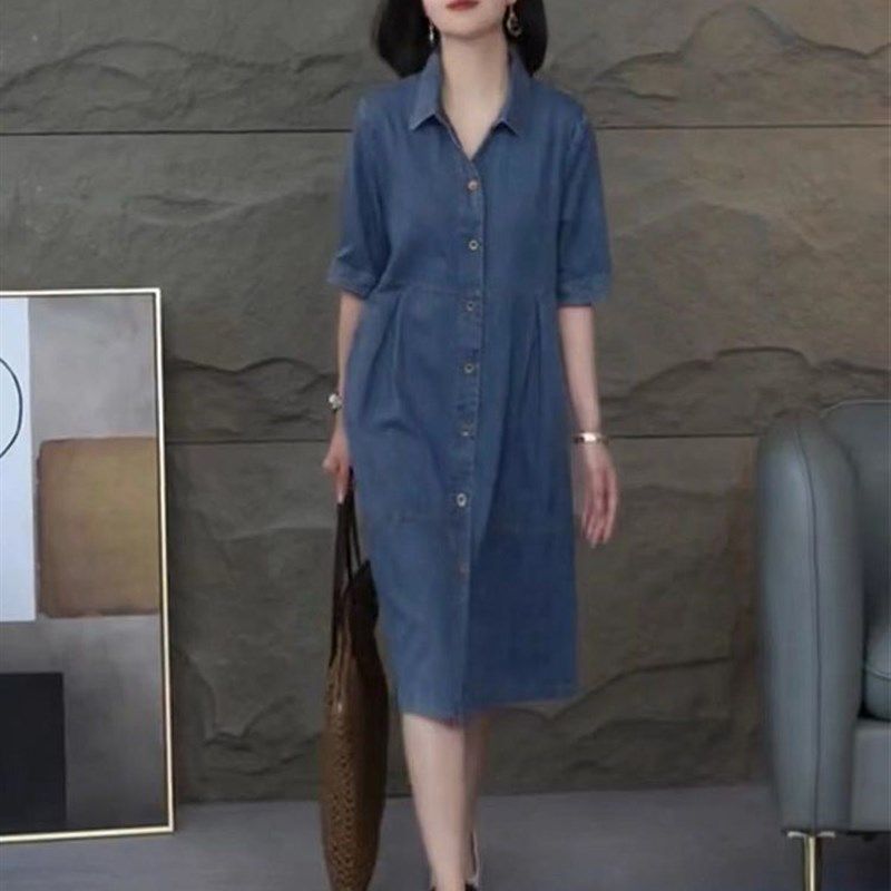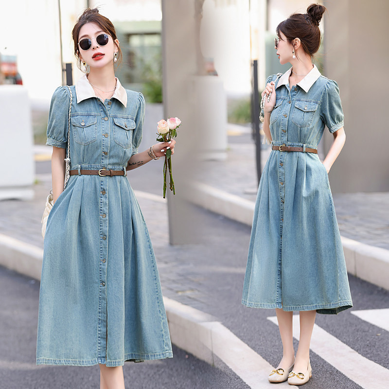 2025牛仔连衣裙夏季短袖翻领女装韩版显瘦高腰裙子A字裙中长款