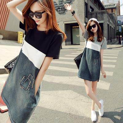 2019春夏新款短袖拼接牛仔连衣裙女韩版大码女装A字裙显瘦打底裙