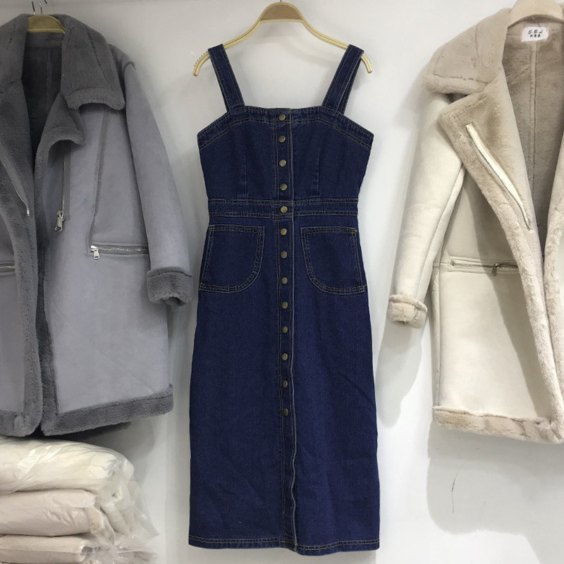 古与色 韩版复古水洗单排扣宽松腰A字中长裙休闲牛仔背心连衣裙春
