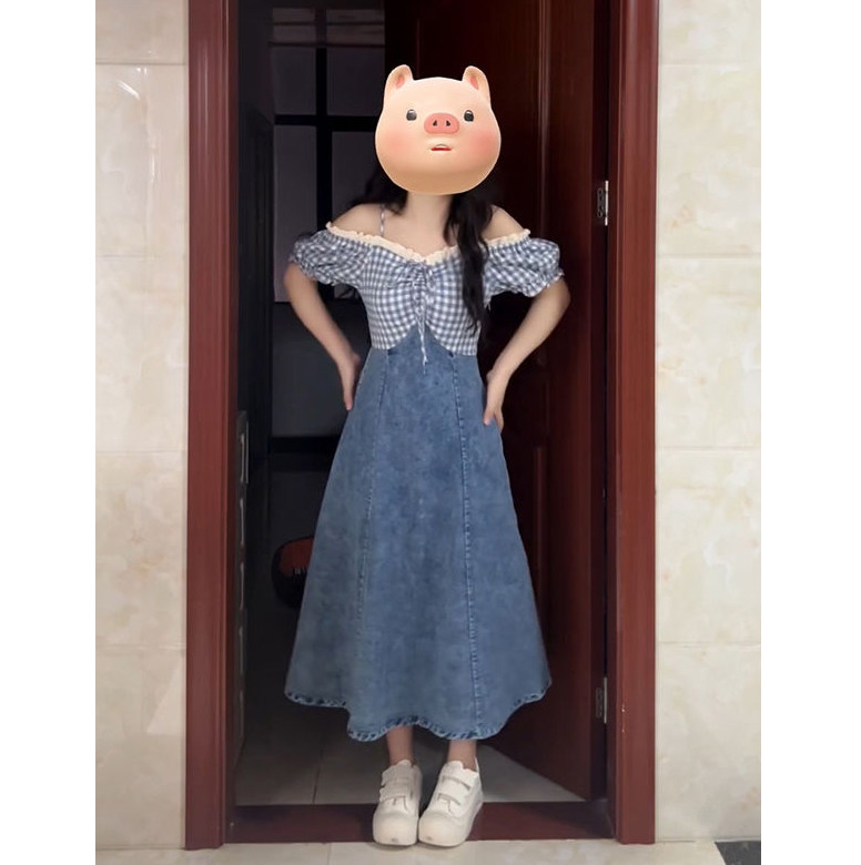 韩版复古学院风格纹拼接牛仔露肩吊带连衣裙女夏季绝美过膝A字裙