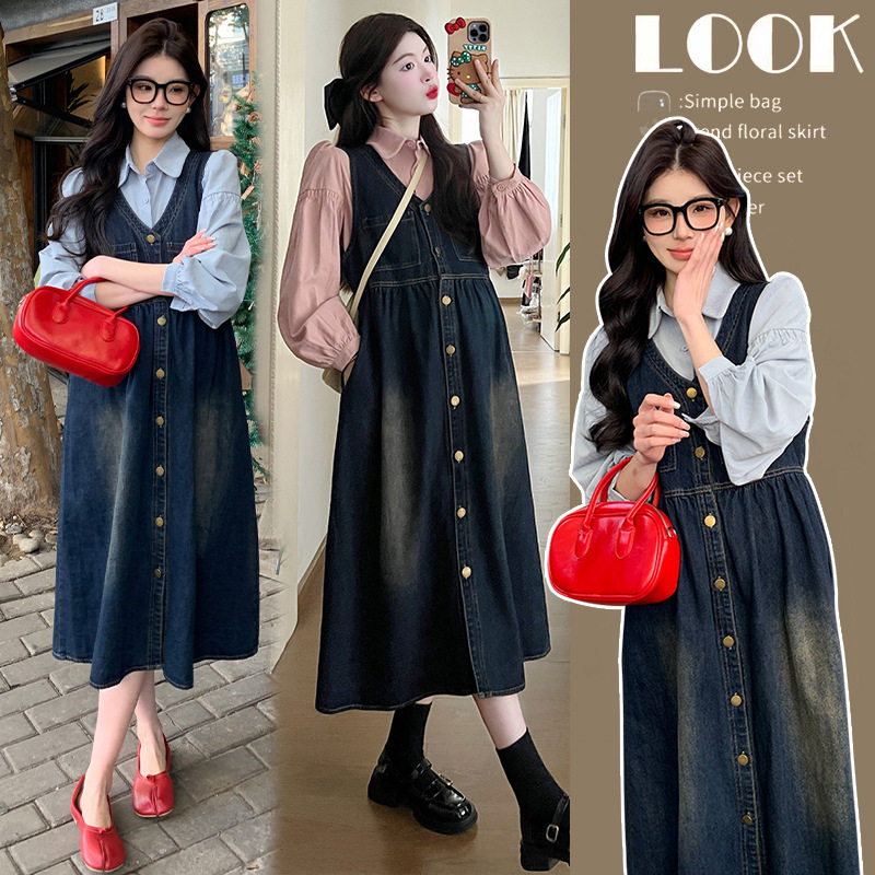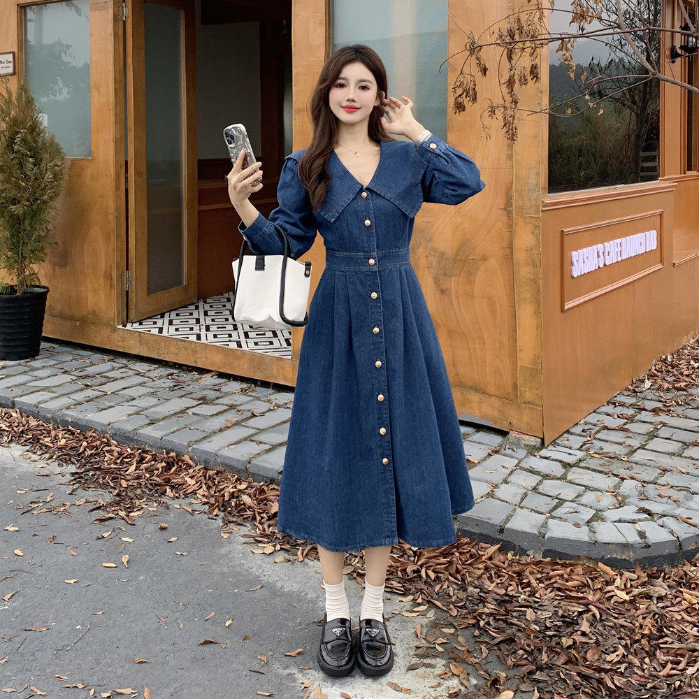 韩版简约通勤风单排扣学院牛仔长款连衣裙女收腰修身显瘦A字长裙