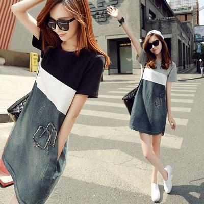薄款牛仔连衣裙女2025夏季韩版短袖T恤拼接宽松百搭显瘦中长a字裙