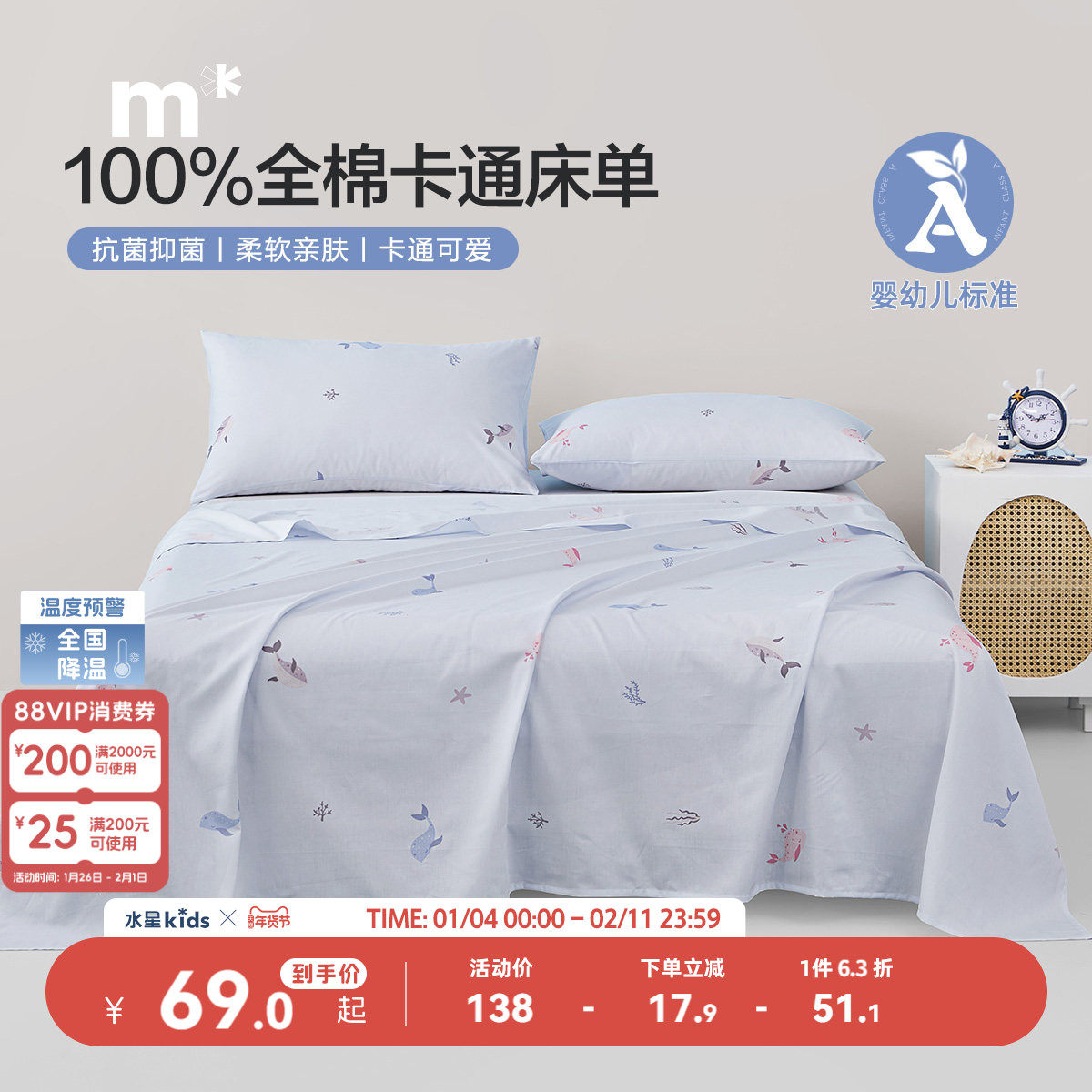 水星儿童纯棉床单单件婴幼儿A类抗菌100全棉床单纯棉宿舍单人床单