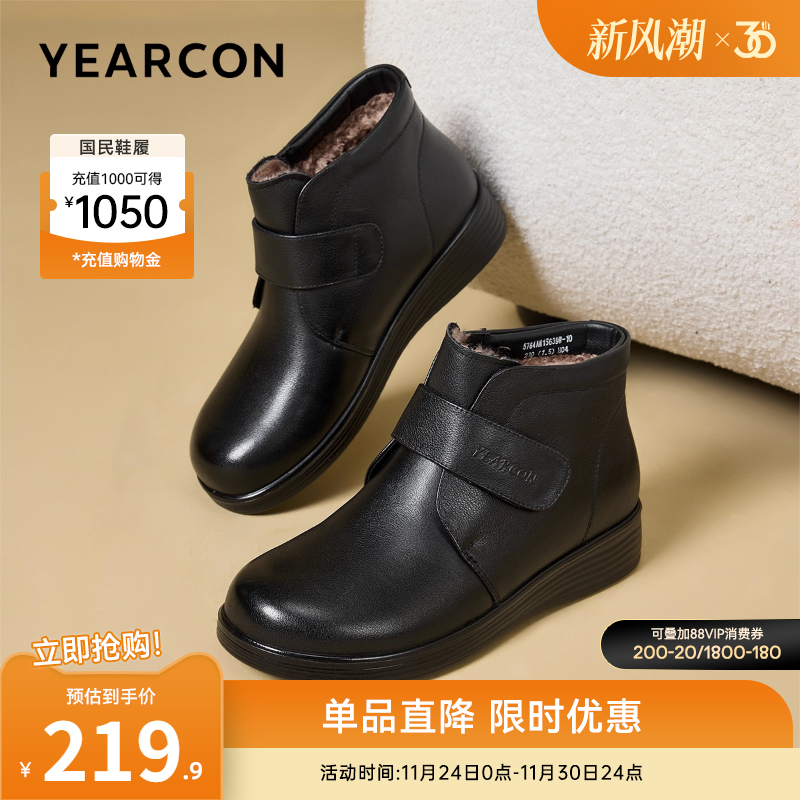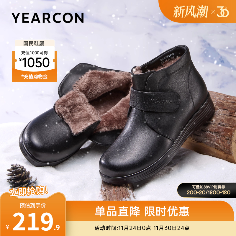 意尔康女鞋冬季棉鞋女士加绒真皮短靴粗跟气质显瘦及踝靴妈妈皮鞋