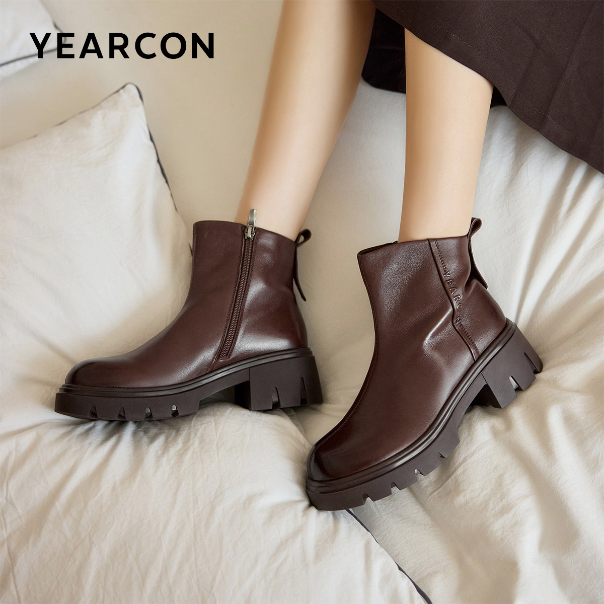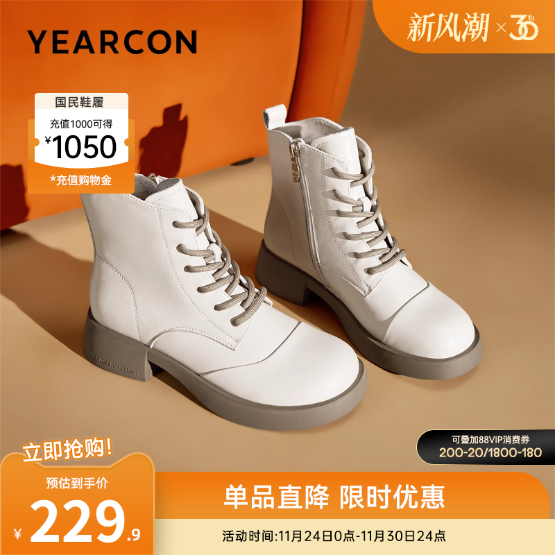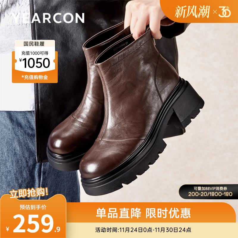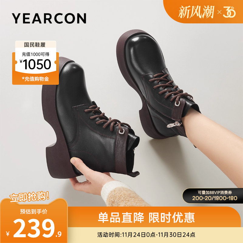 意尔康女鞋冬季复古真皮休闲加绒马丁靴粗跟英伦风短靴小个子女士