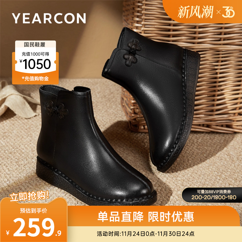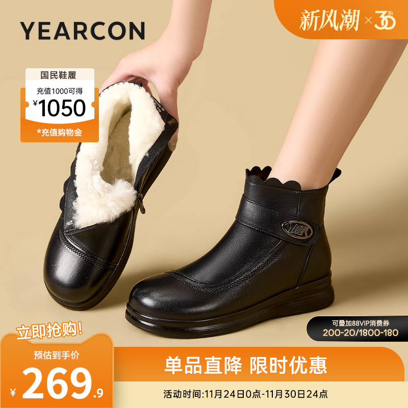 意尔康女鞋2025冬季真皮法式中老年妈妈棉鞋羊皮加绒短靴女士皮鞋