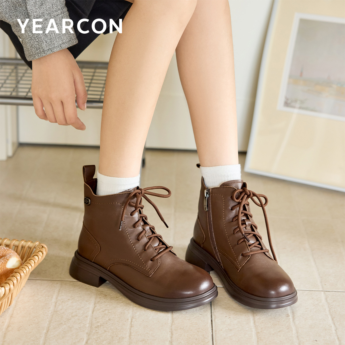 意尔康女鞋2025冬季皮鞋复古真皮休闲马丁靴粗跟英伦加绒保暖短靴