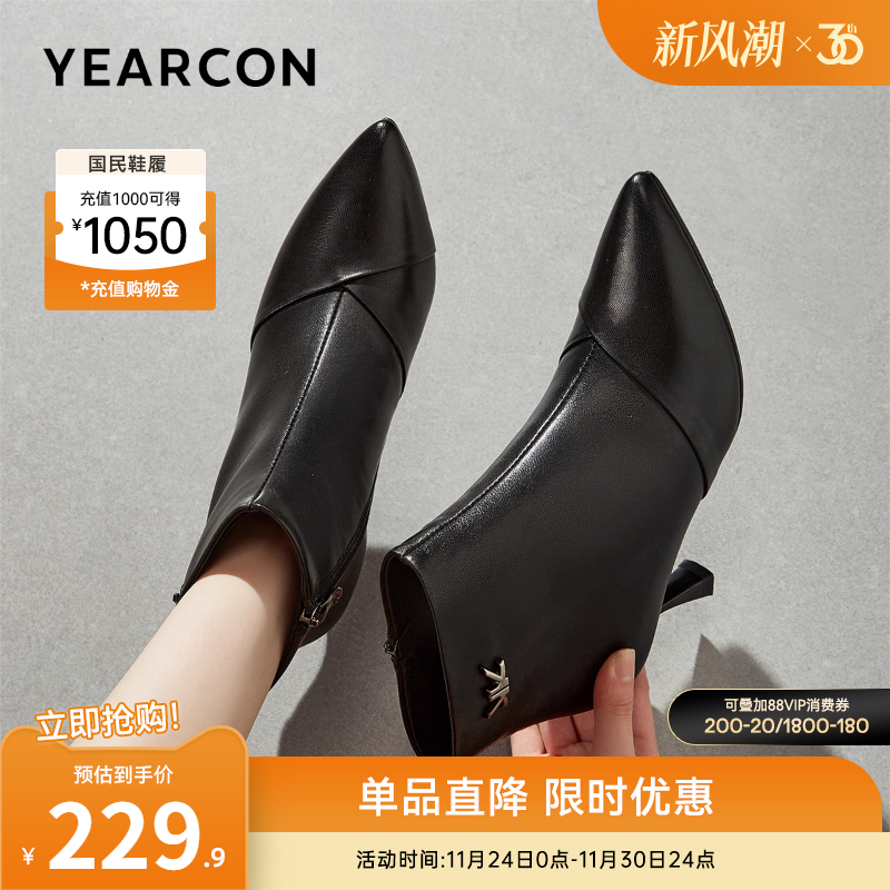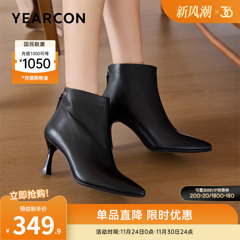 意尔康女鞋冬季真皮加绒短靴羊皮尖头细跟法式气质及踝靴女士皮鞋