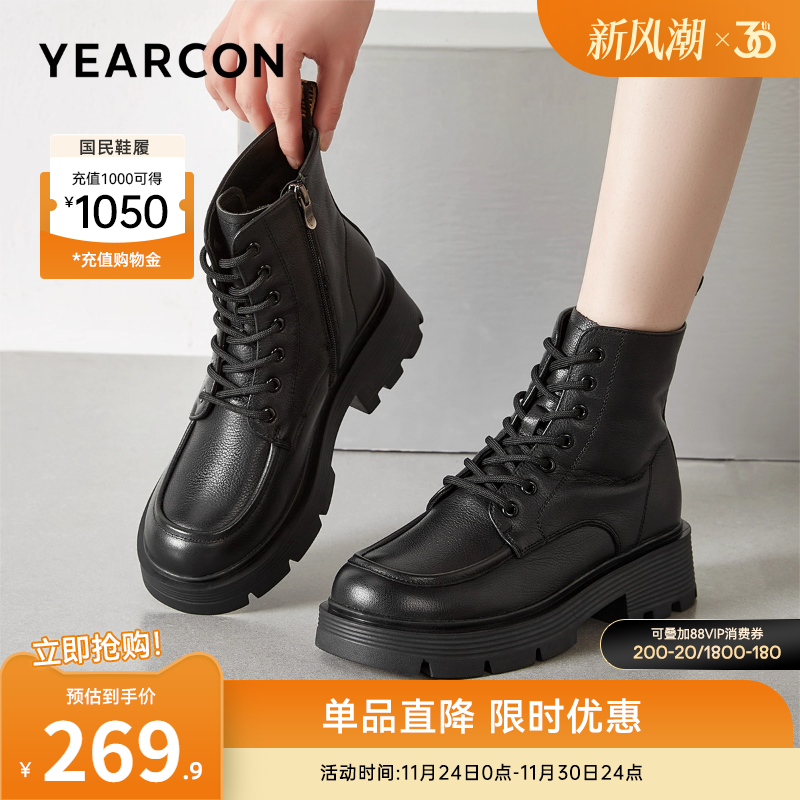 意尔康女鞋冬季真皮复古休闲加绒马丁靴粗跟英伦风短靴小个子女士