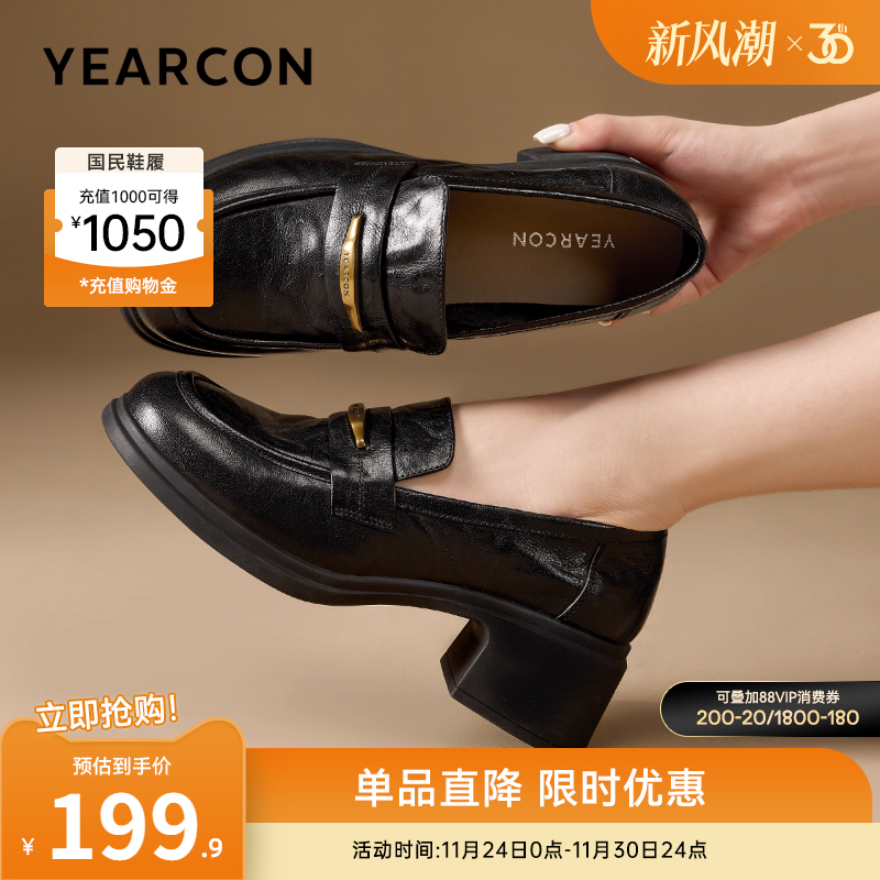 意尔康女鞋2025秋季真皮乐福鞋面试粗跟通勤小皮鞋羊皮单鞋软面