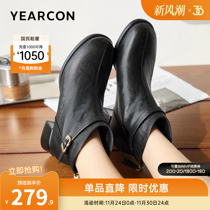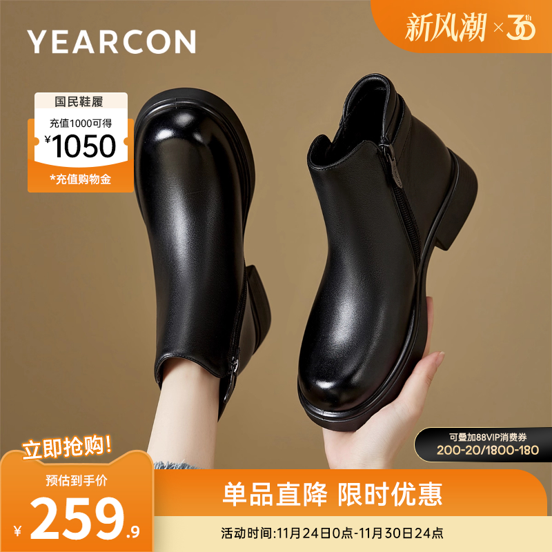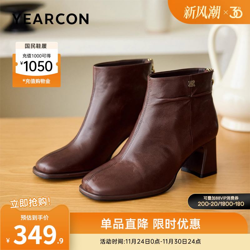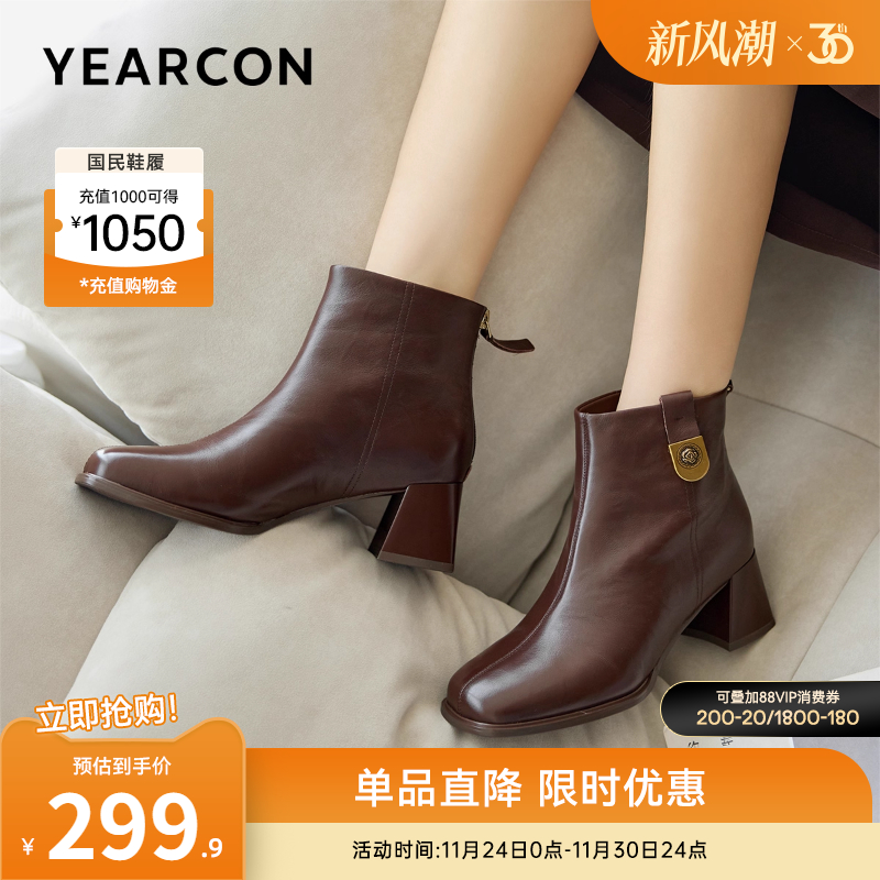 意尔康女鞋2025冬季真皮法式短靴粗跟气质显瘦配裙子单靴及踝靴女