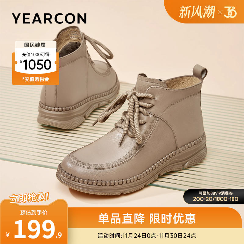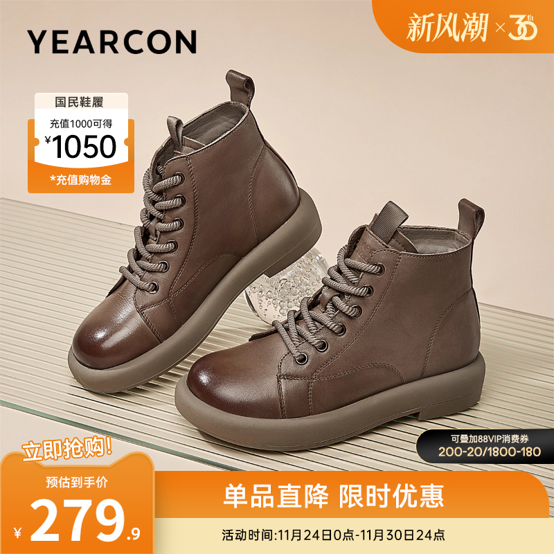 意尔康女鞋冬季真皮复古户外休闲加绒马丁靴粗跟英伦风短靴小个子