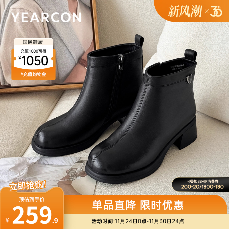 意尔康女鞋2025冬季真皮法式加绒短靴粗跟气质羊皮及踝靴女士皮鞋