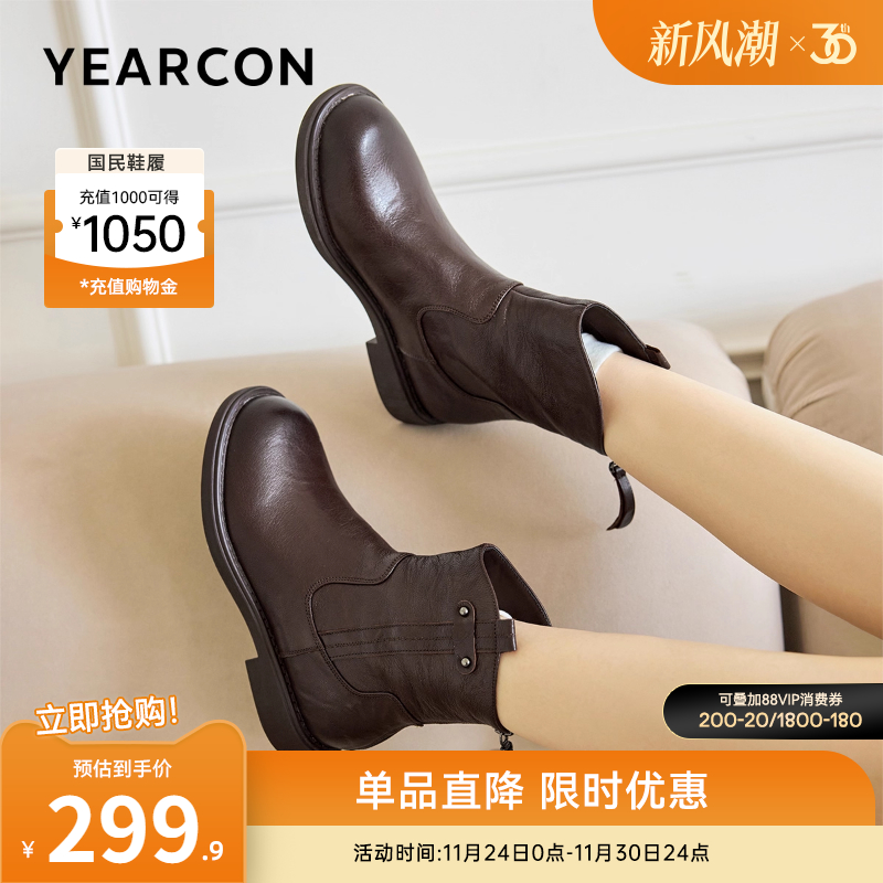 意尔康女鞋秋冬真皮短靴粗跟单靴气质英伦显瘦复古及踝靴女士皮鞋