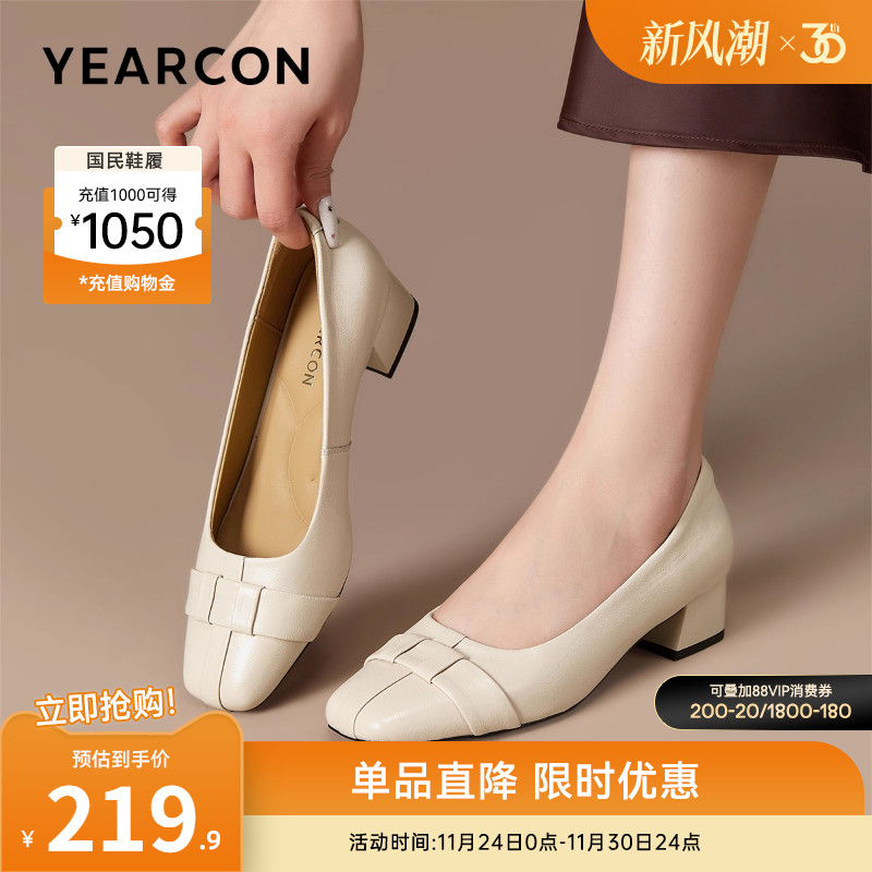 意尔康女鞋2025秋季真皮粗跟方头羊皮单鞋法式通勤工作皮鞋配裙子