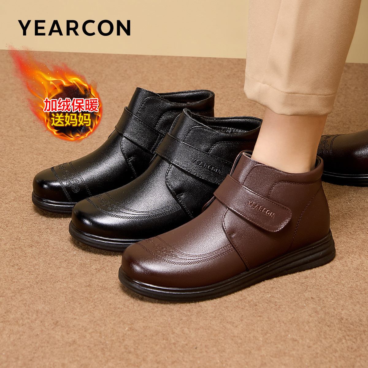 意尔康妈妈鞋子冬季新款加绒加厚软底短靴真皮棉鞋中老年人皮鞋女