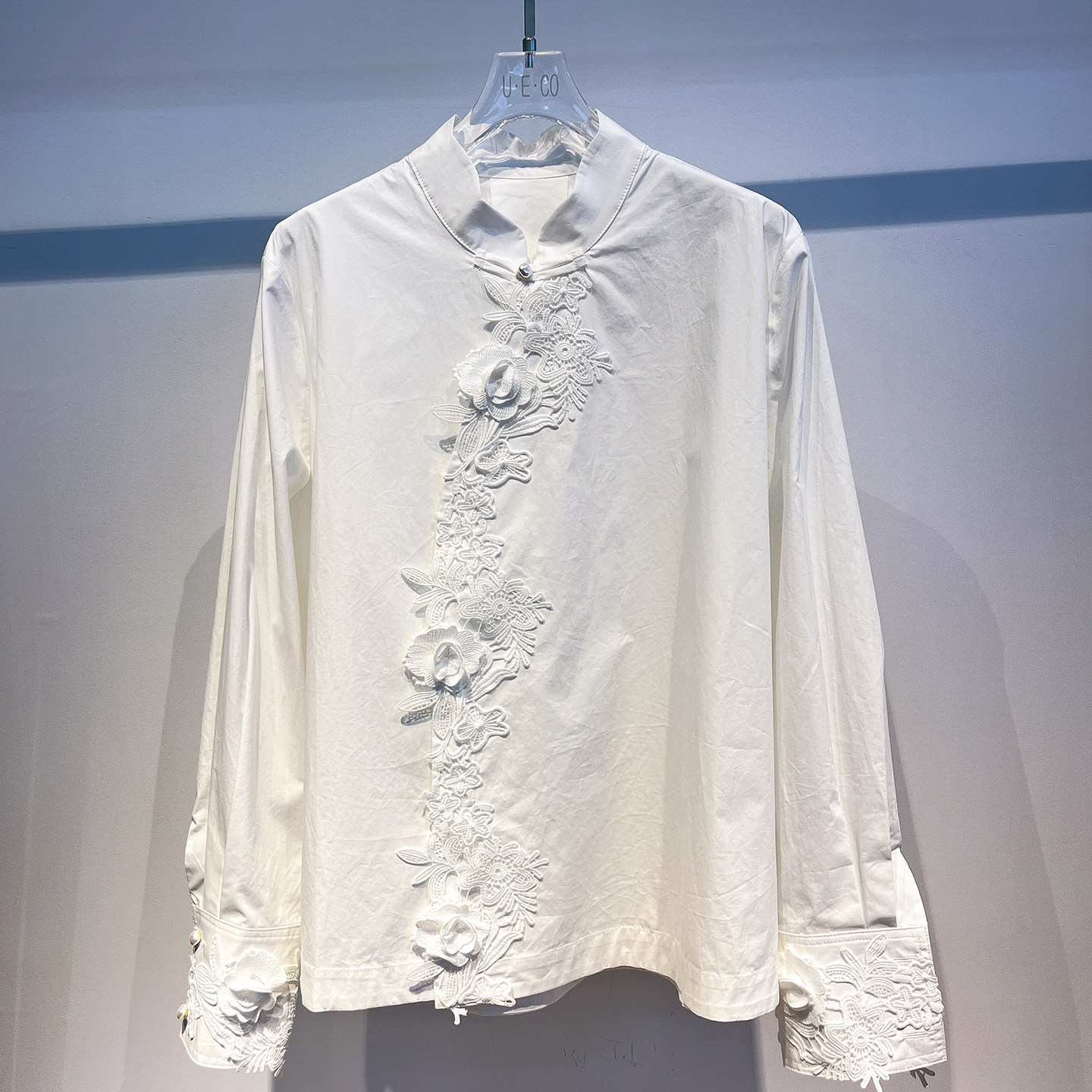 欧洲站春装新款国风新中式重工立体花边斜襟立领长袖棉衬衫上衣女