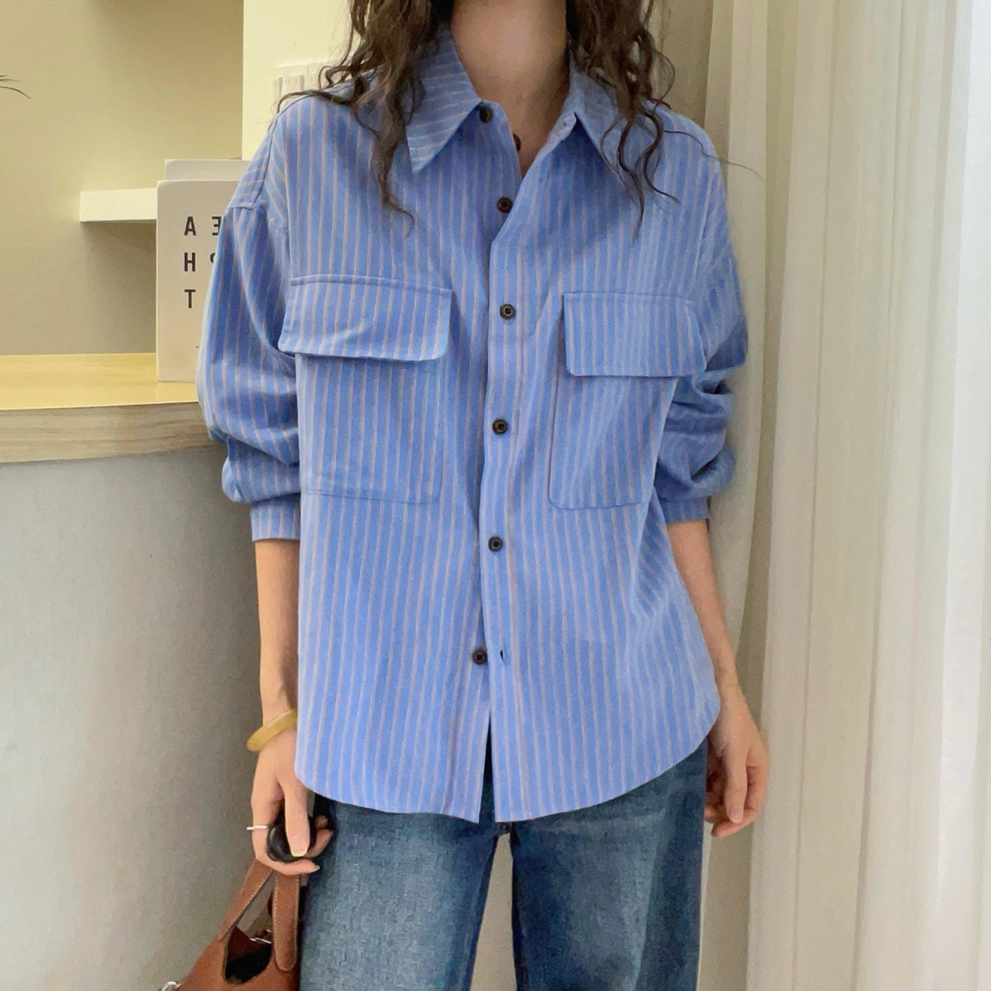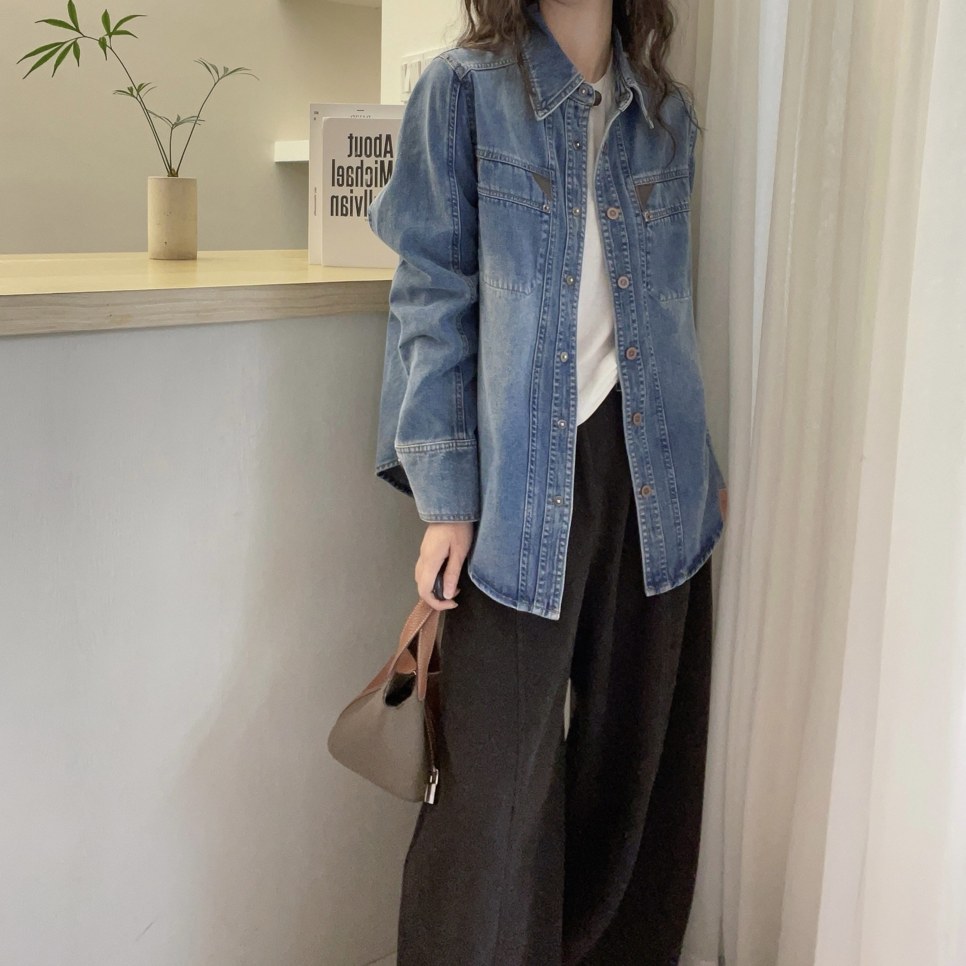 欧洲站2025春装新款复古牛仔衬衫女POLO领宽松休闲蓝色纽扣衬衣女