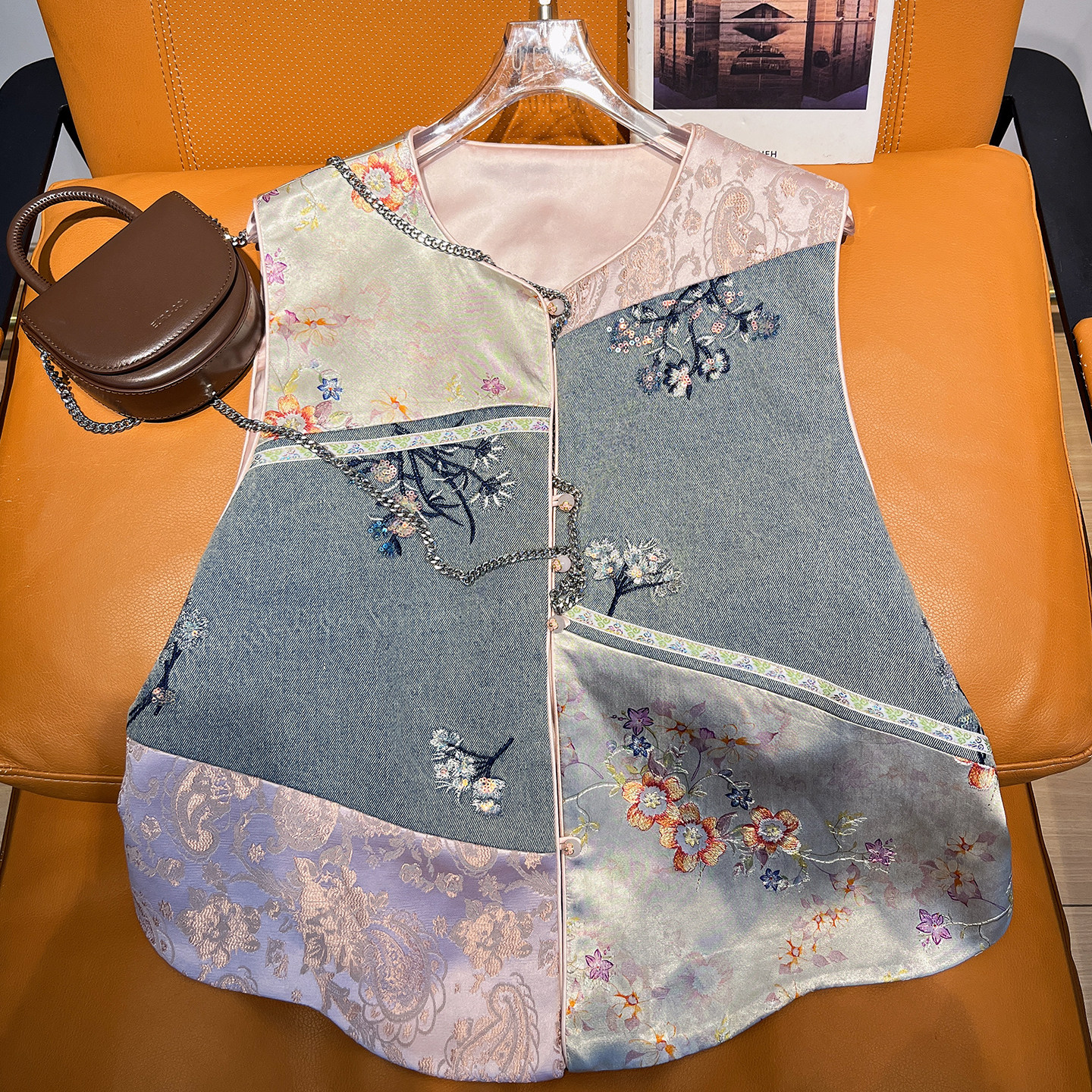 欧洲站春装新款新中式撞色拼接亮片刺绣弧形下摆百搭马甲砍肩女潮