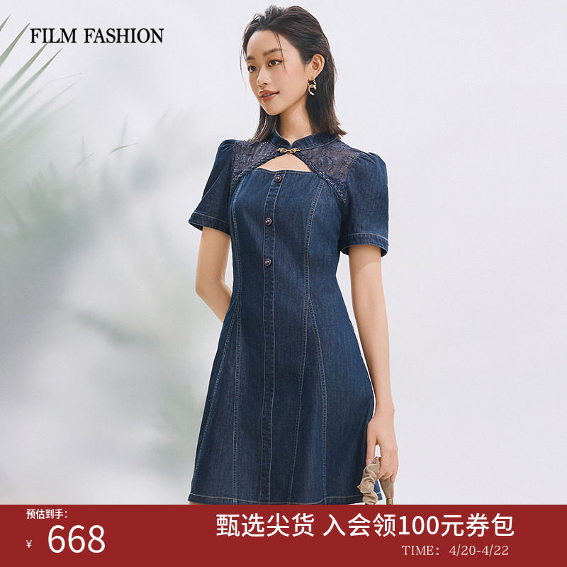 一电影一时装夏季新款牛仔短款旗袍连衣裙新中式改良立领收腰女士