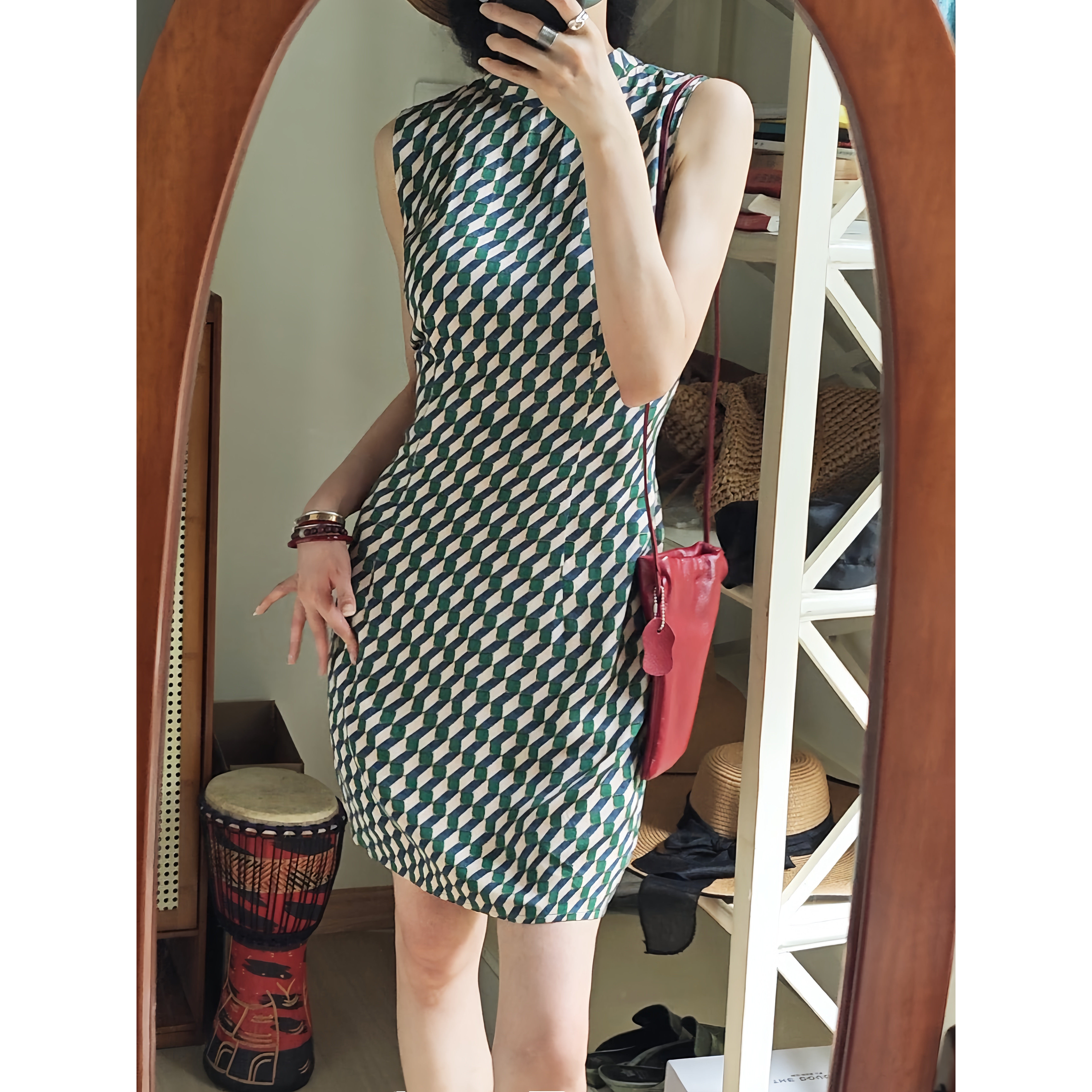 APOZi collection【博弈山水】新中式斜襟棋盘格短款天丝旗袍裙