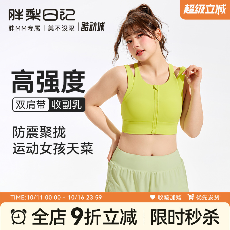胖梨日记前拉链大码运动内衣女跑步防震高强度一体式胖mm健身文胸