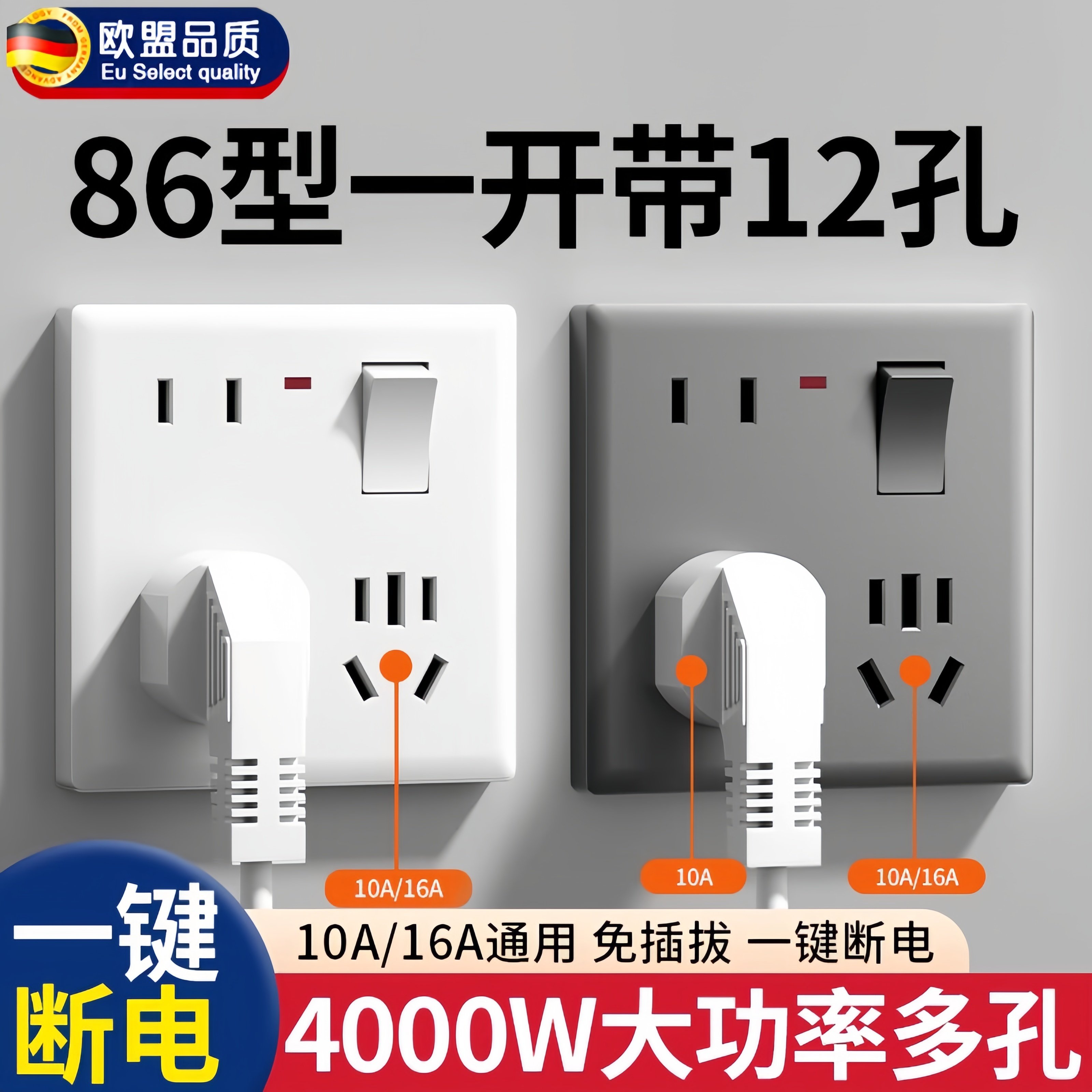 大功率一开十二孔插座10a16a家用厨房多孔扩展 86型1开12孔带开关
