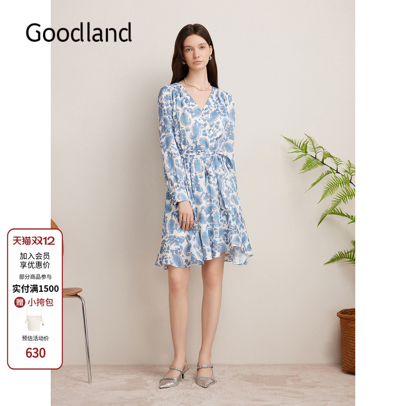 Goodland美地女装春季气质印花法式连衣裙长款v领收腰裹身裙
