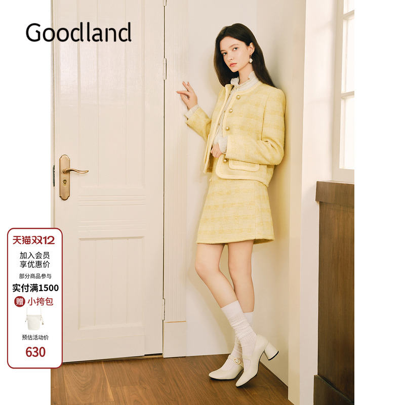 Goodland美地女装春季小香风木耳花边羊毛混纺针织连衣裙