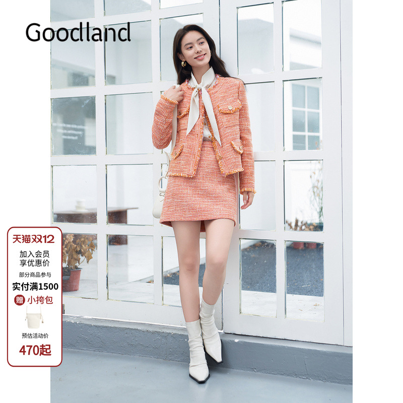 Goodland美地女装春季千金风粉色流苏小香风花纱圆领外套