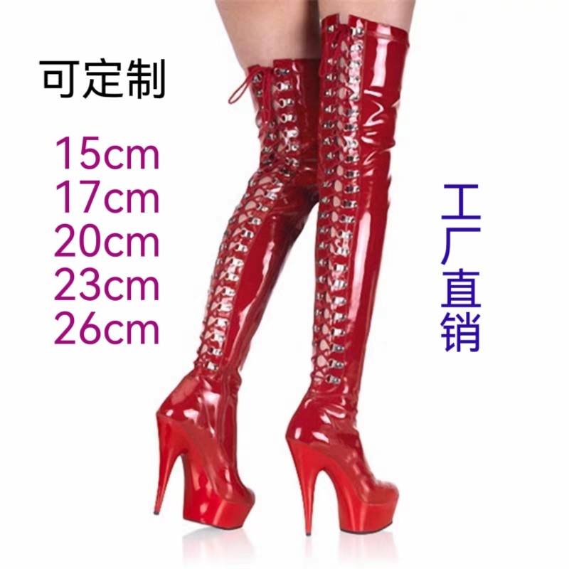 15cm过膝钢管舞女网红靴子亮面漆皮性感高跟后系带细跟大小腿女靴