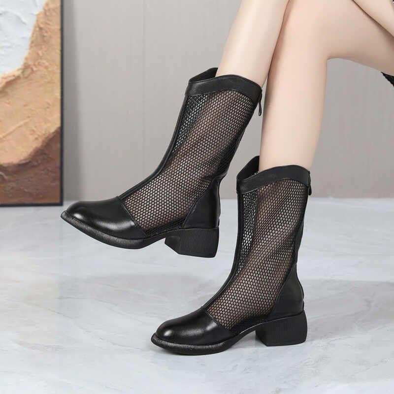 2025新款女靴中跟真皮网纱靴高跟靴子粗跟短靴女镂空网鞋春秋单靴