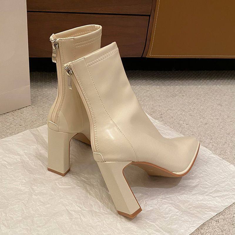 马丁靴女靴子2025新款秋冬网红瘦瘦靴方头粗跟短靴裸靴米色高跟鞋