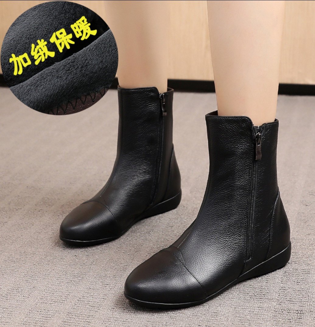 真皮秋季平底短靴女靴子软底中筒侧拉链中老年妈妈鞋棉加绒百搭冬