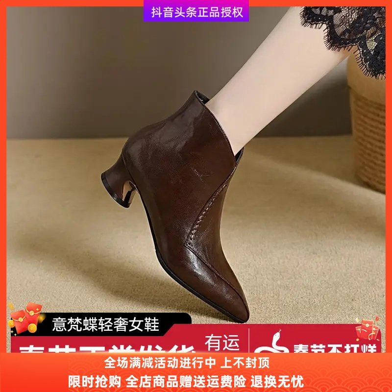 意梵蝶轻奢女鞋女靴新款真皮尖头黑色靴子时尚软底软面短靴粗跟鞋