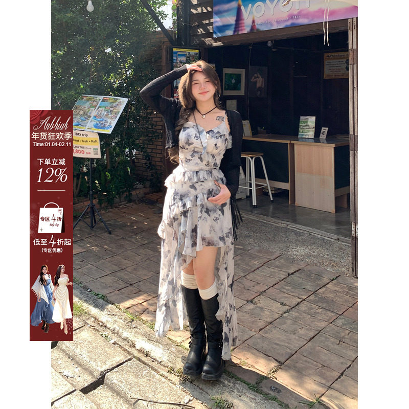 安妮不火 碎花蝴蝶吊带长裙子女收腰2024早春新款微胖显瘦连衣裙