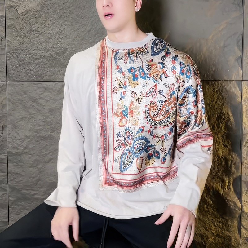 2025新款潮牌民族风时尚印花长袖T恤男士轻奢休闲百搭圆领打底衫