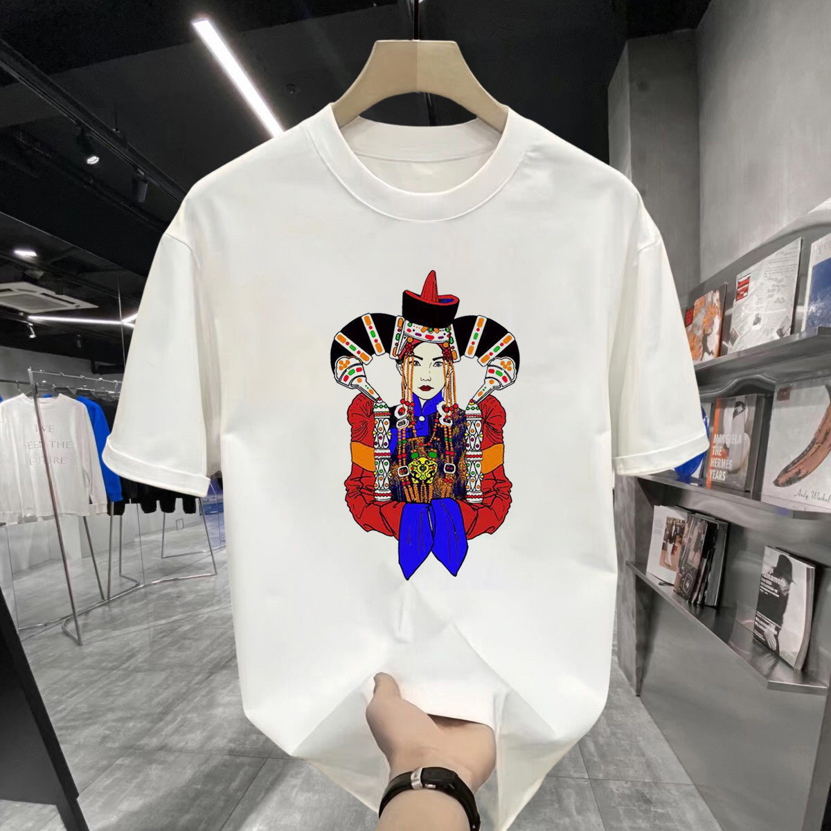 夏季纯棉宽松圆领短袖T恤男潮流民族风印花半袖重磅体恤打底上衣