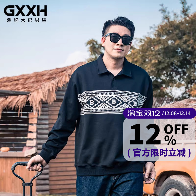 GxxH大码男装长袖T恤秋季男2025新款潮牌民族风印花翻领外穿上衣
