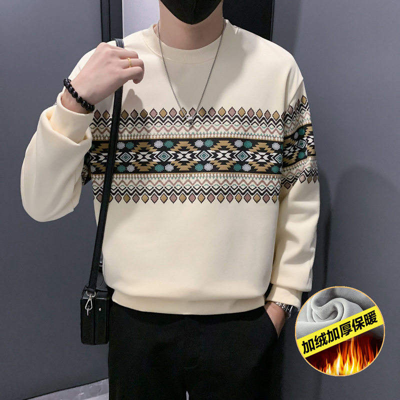 高级感潮牌民族风印花卫衣男秋冬新款ins轻熟内搭长袖加绒T恤上衣