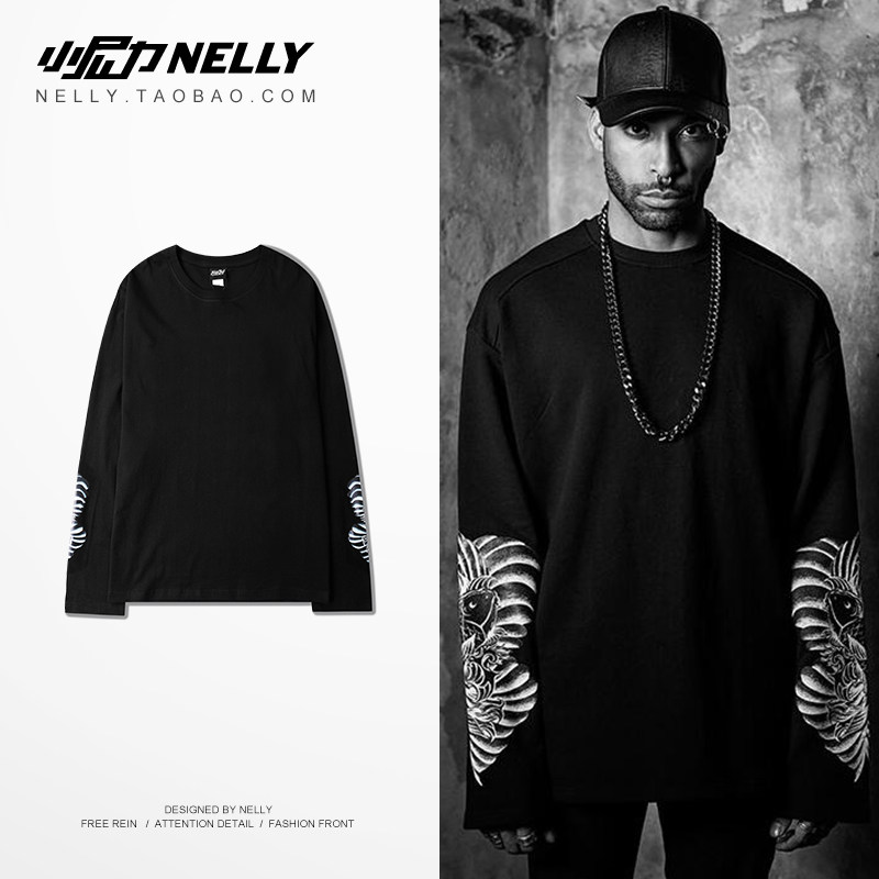 日系潮牌高街中国风暗黑印花民族复古大码纯棉刺青朋克长袖T恤男