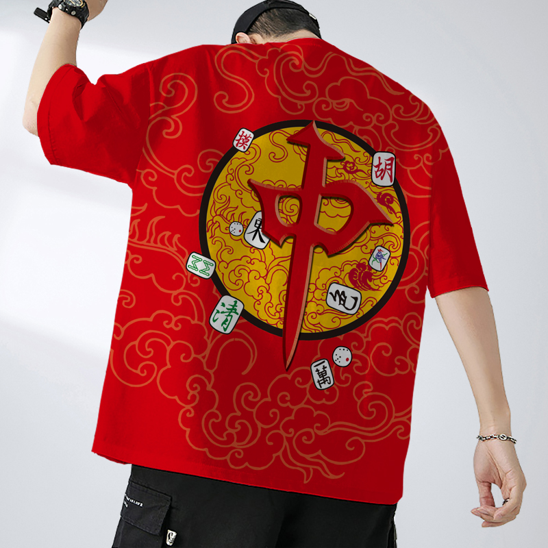 国潮麻将t恤男ins潮流短袖民族风印花半截袖宽松大码圆领红色体恤