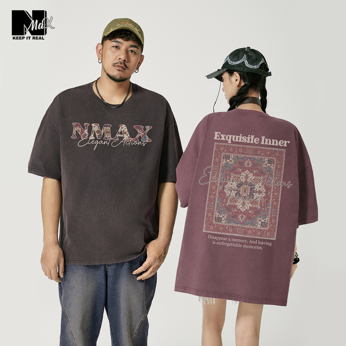NMAX大码潮牌男装夏新品民族风水洗短袖T恤纹样印花复古宽松上衣