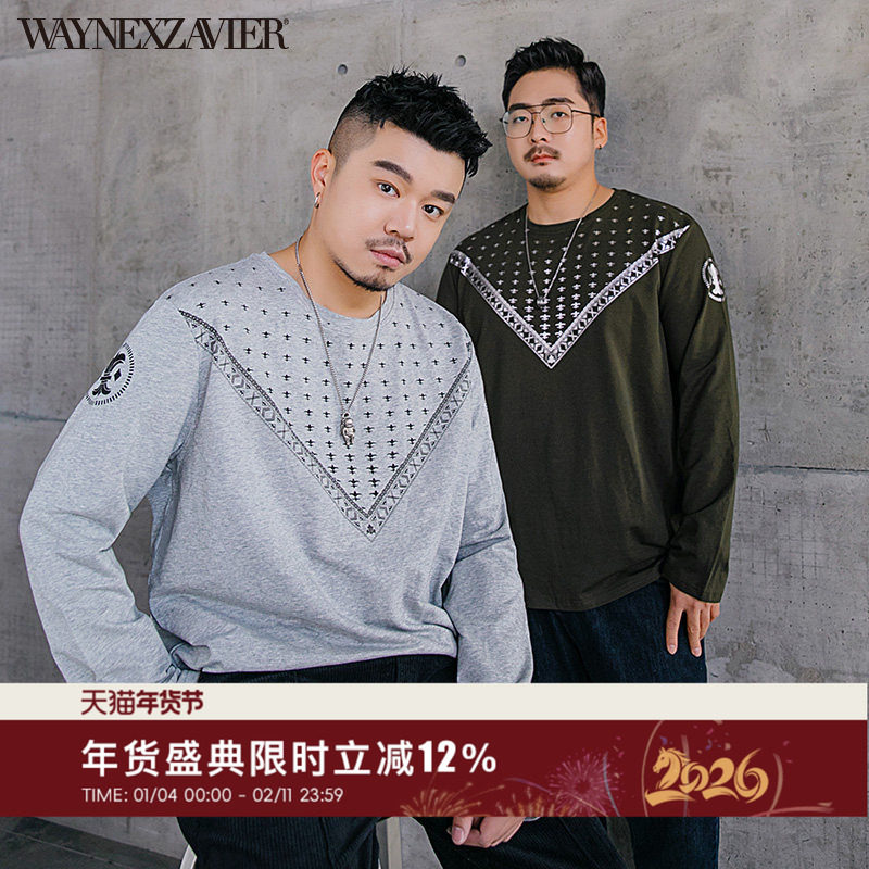 韦恩泽维尔加肥加大民族风大码宽松假两件印花长袖打底T恤男2185