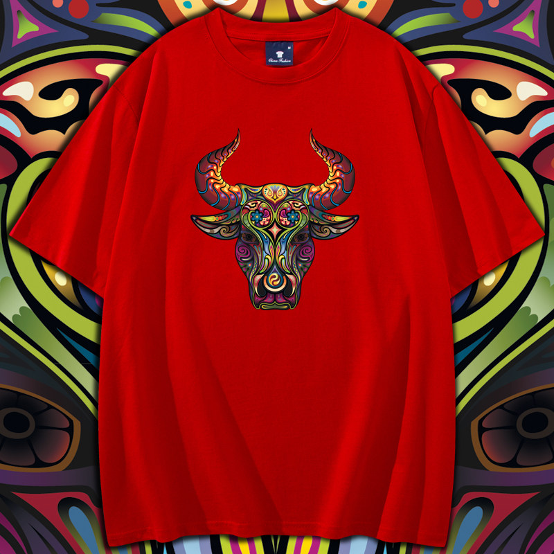 牛头印花短袖T恤男装民族风12生肖动物上衣服纯棉牛王服饰半袖潮