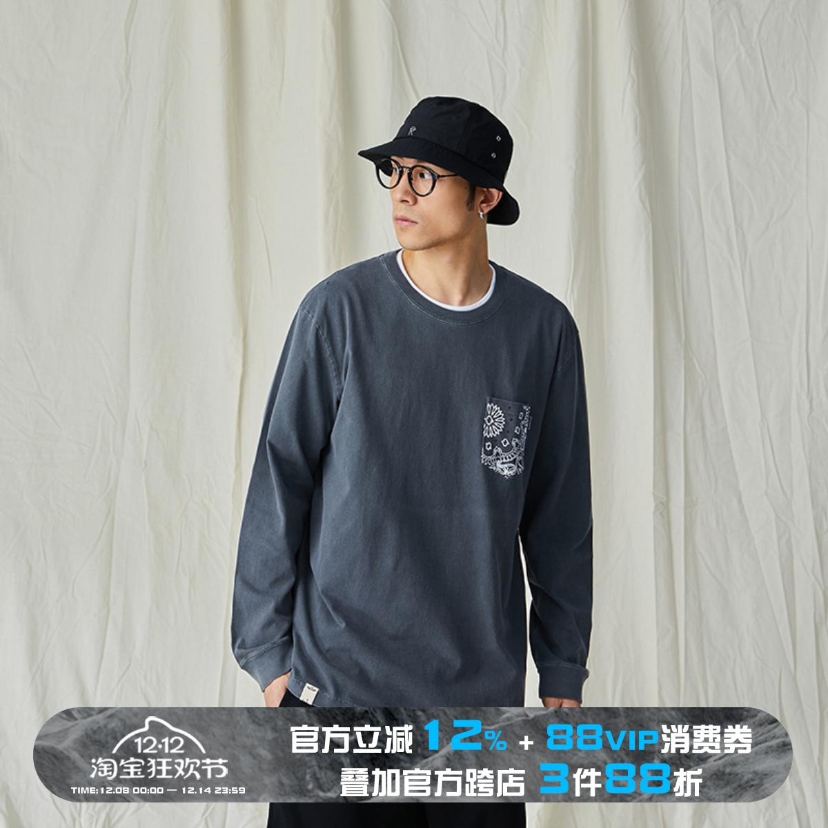 WEDENBORG蜡染水洗做旧民族风口袋腰果印花日系春夏复古长袖T恤男