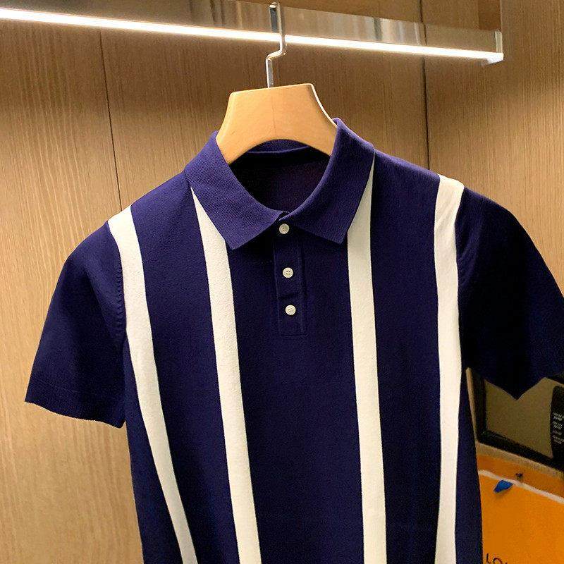 潮牌高端短袖针织polo衫男轻薄春季英伦覆古拼色条纹时尚翻领T恤