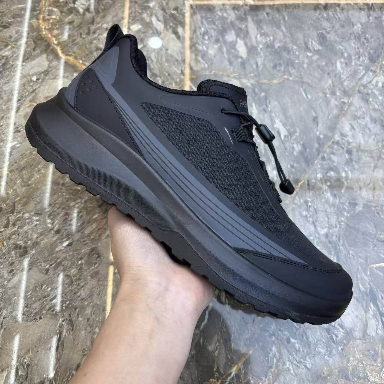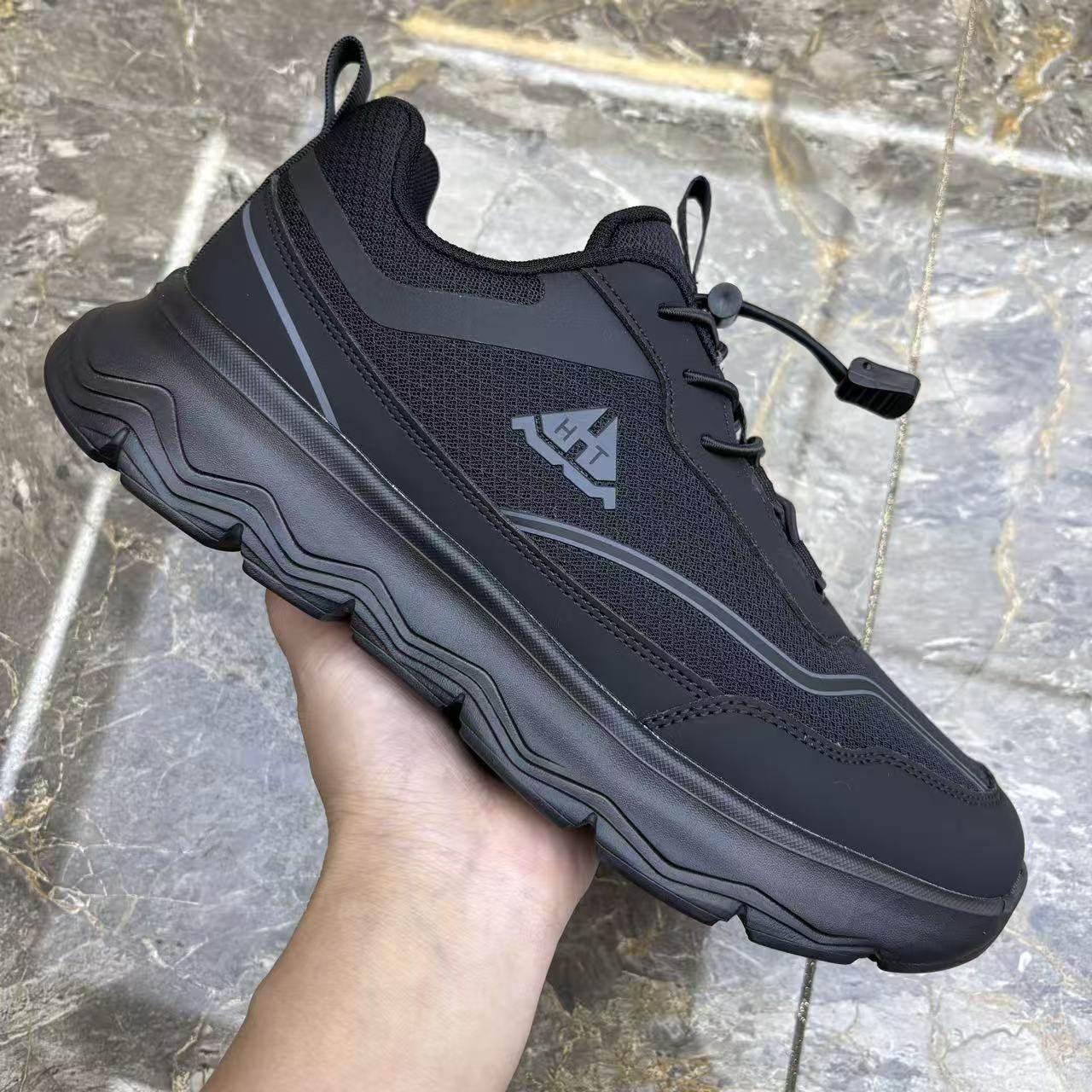 新款透气网面男鞋轻便厚底防滑运动鞋黑灰色弹力带套脚休闲户外鞋
